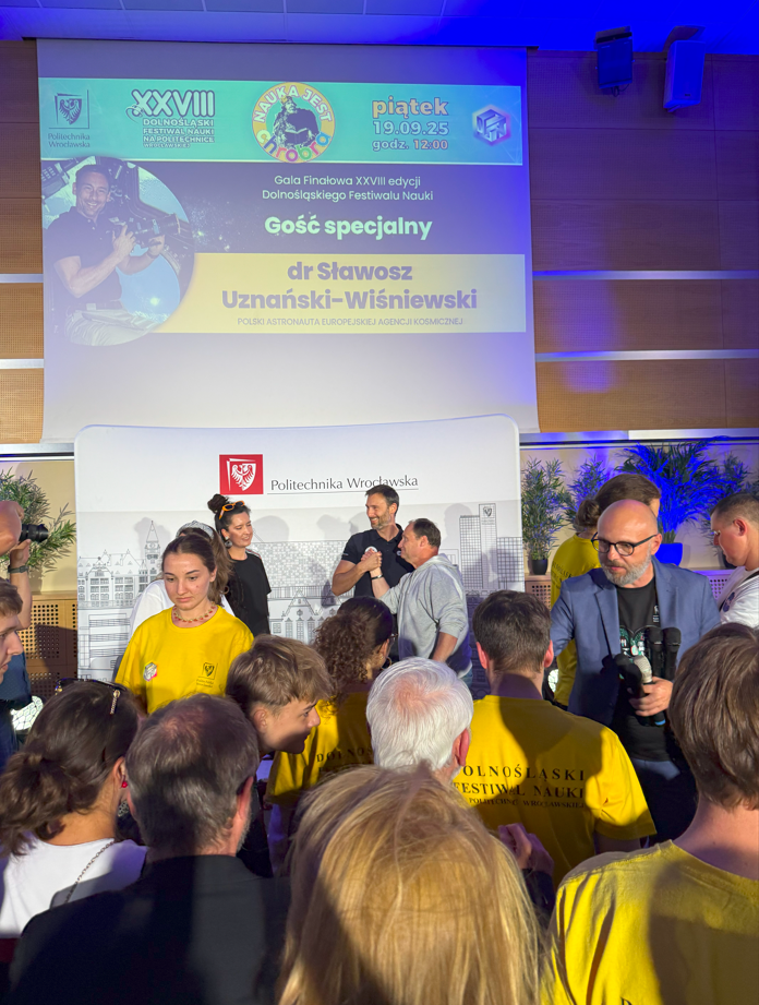 Wrocławska edycja DFN zakończyła się … kosmicznie! Podczas Gali Finałowej Festiwalu na Politechnice Wrocławskiej gościem specjalnym był dr Sławosz Uznański-Wiśniewski, który spotkał się młodzieżą i odpowiedział na wiele pytań, m.in. o pobyt na Międzynarodowej Stacji Kosmicznej (ISS). Spotkanie przyciągnęło do Centrum Kongresowego PWr prawie 650 uczestników – przede wszystkim uczniów szkół podstawowych i średnich. W wydarzeniu wzięli udział także koordynatorzy DFN z poszczególnych jednostek – IITD PAN reprezentowała dr hab. Marta Sochocka.