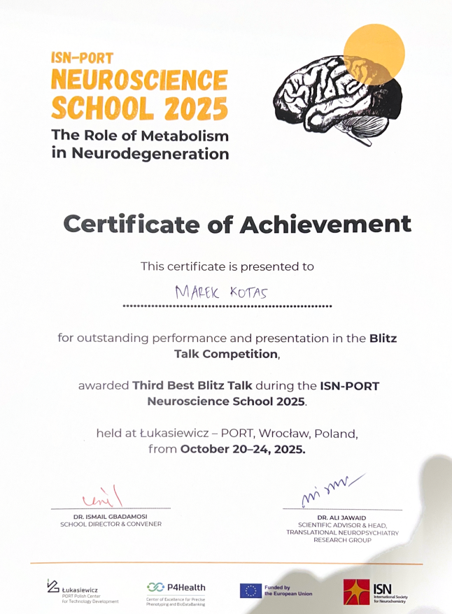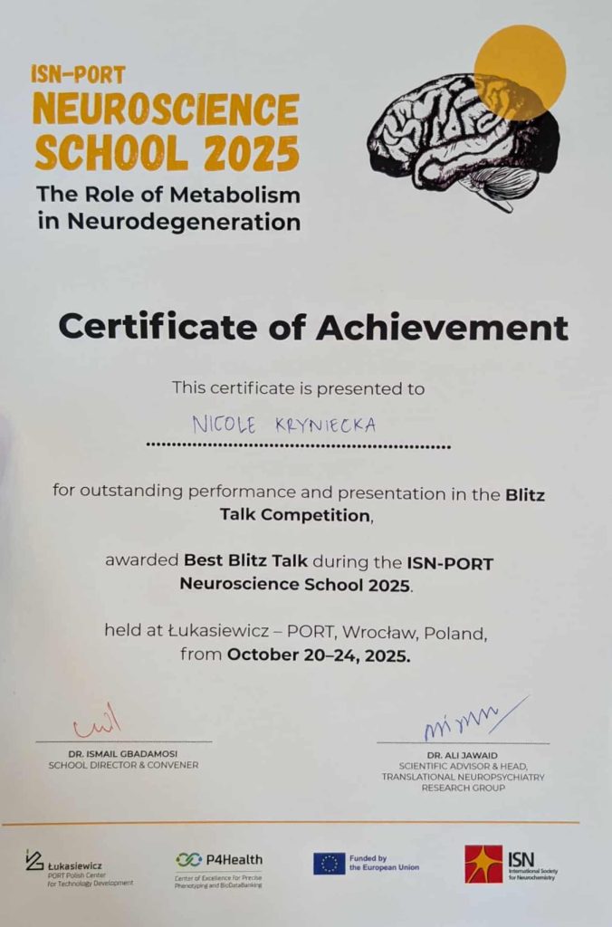 Z przyjemnością informujemy, że nasi doktoranci – mgr Nicole Kryniecka z Laboratorium Wirusologii oraz lek. Marek Kotas z Laboratorium Immunopatologii zostali nagrodzeni podczas 1st ISN-PORT Neuroscience School: Role of Metabolism in Neurodegeneration, wydarzenia organizowanego przez Łukasiewicz – PORT Polski Ośrodek Rozwoju Technologii w dniach 20-24.10.2025.