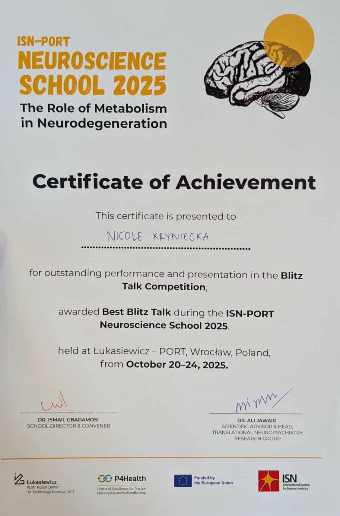 Z przyjemnością informujemy, że nasi doktoranci – mgr Nicole Kryniecka z Laboratorium Wirusologii oraz lek. Marek Kotas z Laboratorium Immunopatologii zostali nagrodzeni podczas 1st ISN-PORT Neuroscience School: Role of Metabolism in Neurodegeneration, wydarzenia organizowanego przez Łukasiewicz – PORT Polski Ośrodek Rozwoju Technologii w dniach 20-24.10.2025.