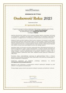 Dr Agnieszka Razim została nominowana do tego zaszczytnego tytułu za badania nad wpływem niedożywienia na mikrobiom człowieka, ze szczególnym uwzględnieniem roli bakteryjnych pęcherzyków zewnątrzkomórkowych.