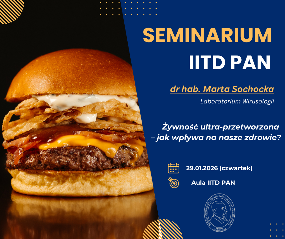 Zapraszamy na seminarium IITD, które odbędzie się 29.01.2026 r. (czwartek) o godz. 9:00 w auli Instytutu, w czasie którego dr hab. Marta Sochocka (Laboratorium Wirusologii) wygłosi wykład pt.: „Żywność ultra-przetworzona – jak wpływa na nasze zdrowie?”.