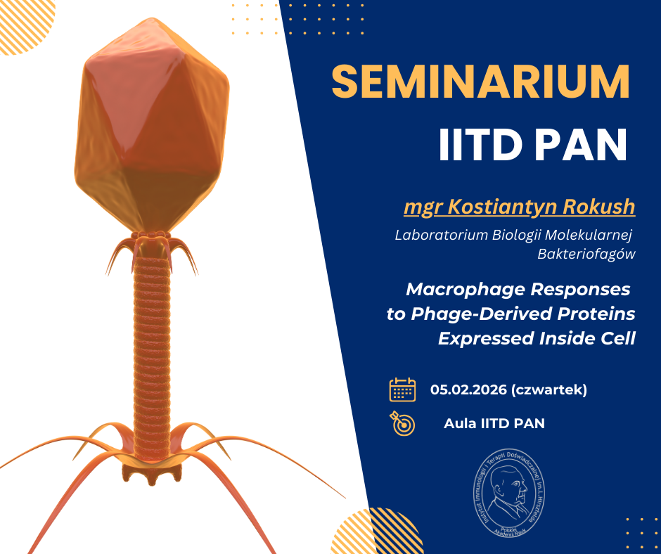 Zapraszamy na seminarium IITD, które odbędzie się 5.02.2026 r. (czwartek) o godz. 9:00 w auli Instytutu, w czasie którego mgr Kostiantyn Rokush (Laboratorium Biologii Molekularnej Bakteriofagów) wygłosi wykład pt.: „Macrophage Responses to Phage-Derived Proteins Expressed Inside Cells”.