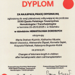 We are pleased to announce that the original work entitled ‘Changes of telomere length in children after haematopoietic stem cell transplantation’, submitted to the poster session during the 32nd Congress of the Polish Society of Haematologists and Transfusionists (PTHiT), which took place on 23-25 October 2025 in Gdańsk, was distinguished from among over 80 submissions to this session.