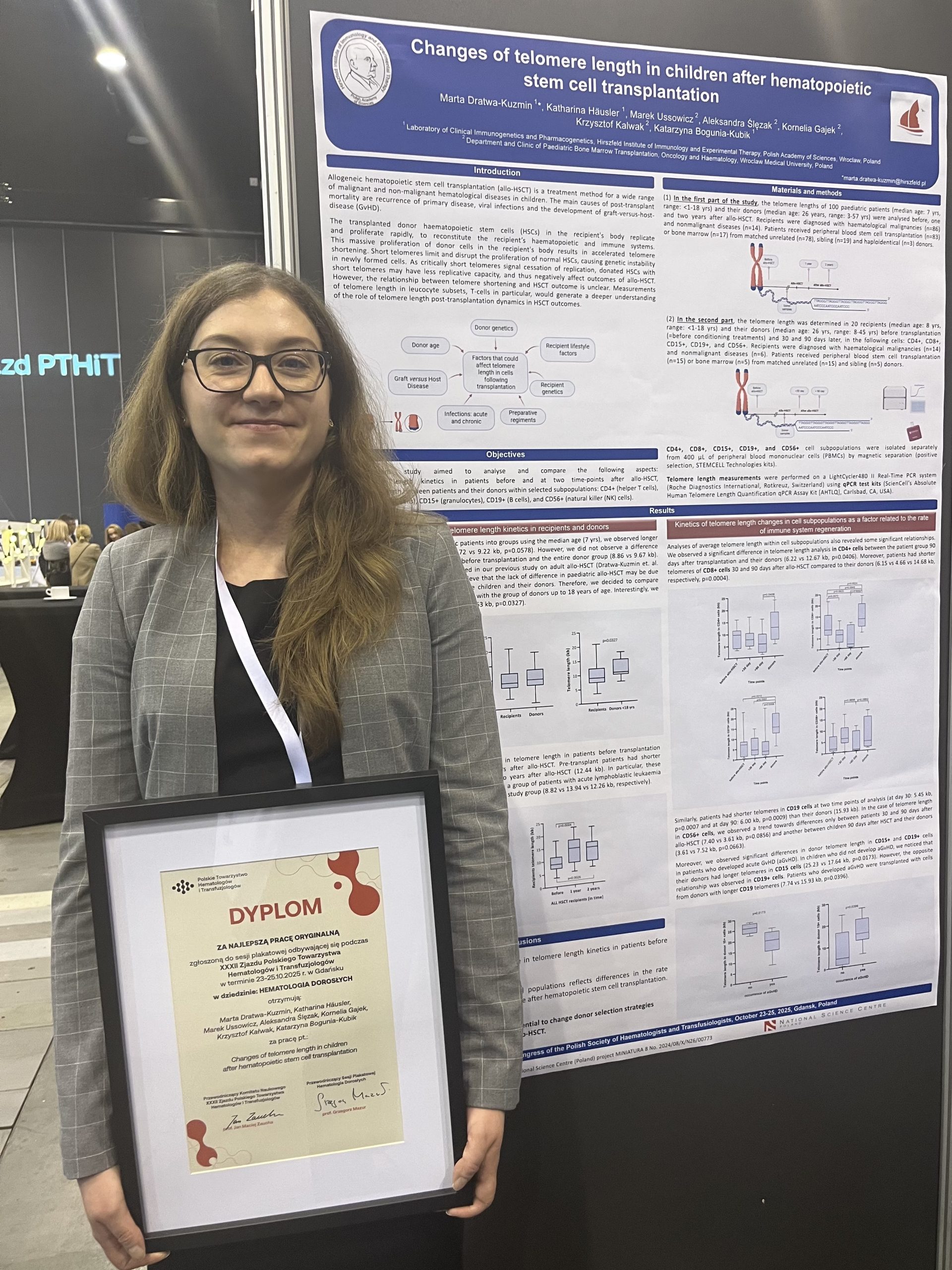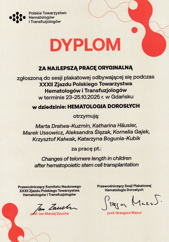 We are pleased to announce that the original work entitled ‘Changes of telomere length in children after haematopoietic stem cell transplantation’, submitted to the poster session during the 32nd Congress of the Polish Society of Haematologists and Transfusionists (PTHiT), which took place on 23-25 October 2025 in Gdańsk, was distinguished from among over 80 submissions to this session.