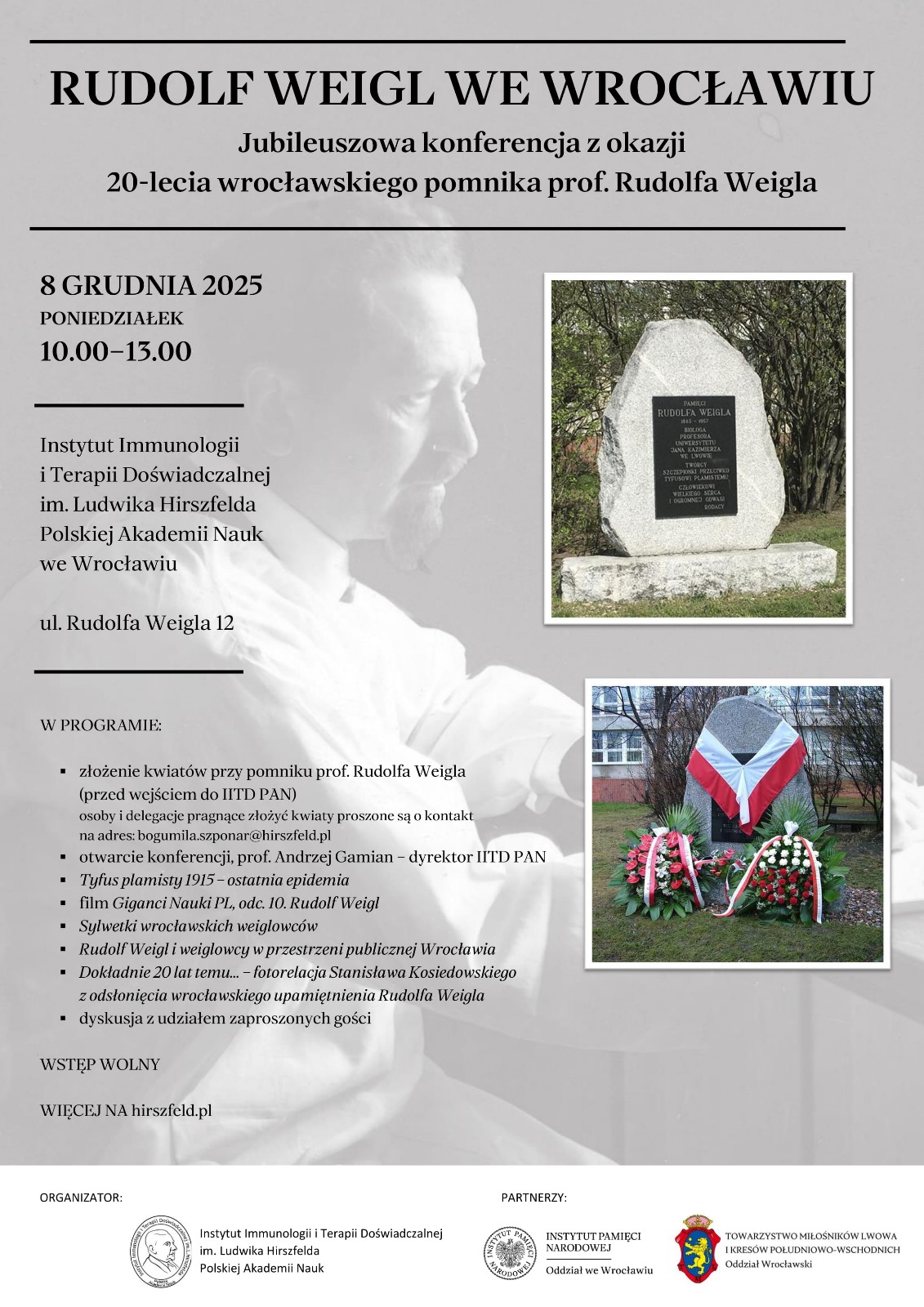 Twenty years later, on December 8, 2025, at 10:00 a.m., we will meet in front of the monument, then proceed to the auditorium and discuss the phenomenon of Weigl’s laboratory and Wrocław’s “Weiglowcy” (Weigl’s followers).