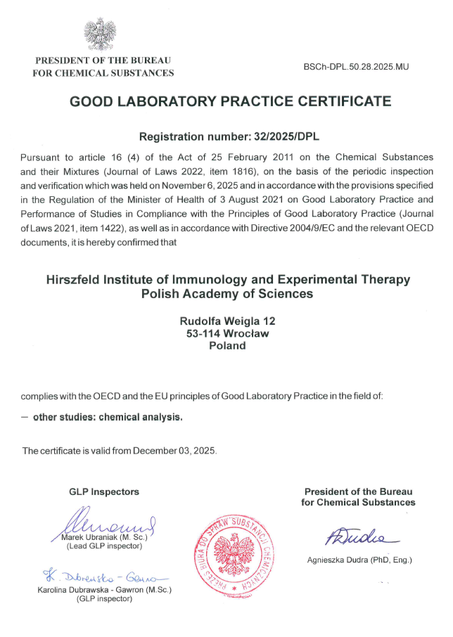 We are pleased to announce that the Institute of Immunology and Experimental Therapy of the Polish Academy of Sciences complies with the principles of Good Laboratory Practice (GLP) in the field of chemical analysis, as confirmed by certificate No. 32/2025/DPL signed on 3 December 2025 by the President of the Office for Chemical Substances.